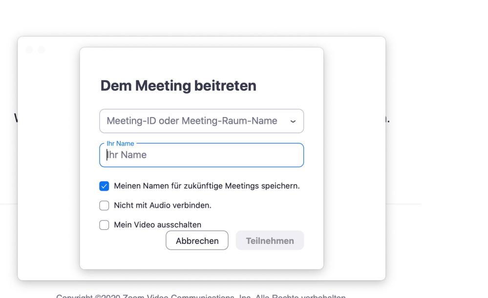 Dann fragt er Dich wahrscheinlich nach der Meeting ID und auch nach dem Kennwort. Beim Namen gibst Du Deinen Namen ein, Dein Vorname reicht aus.